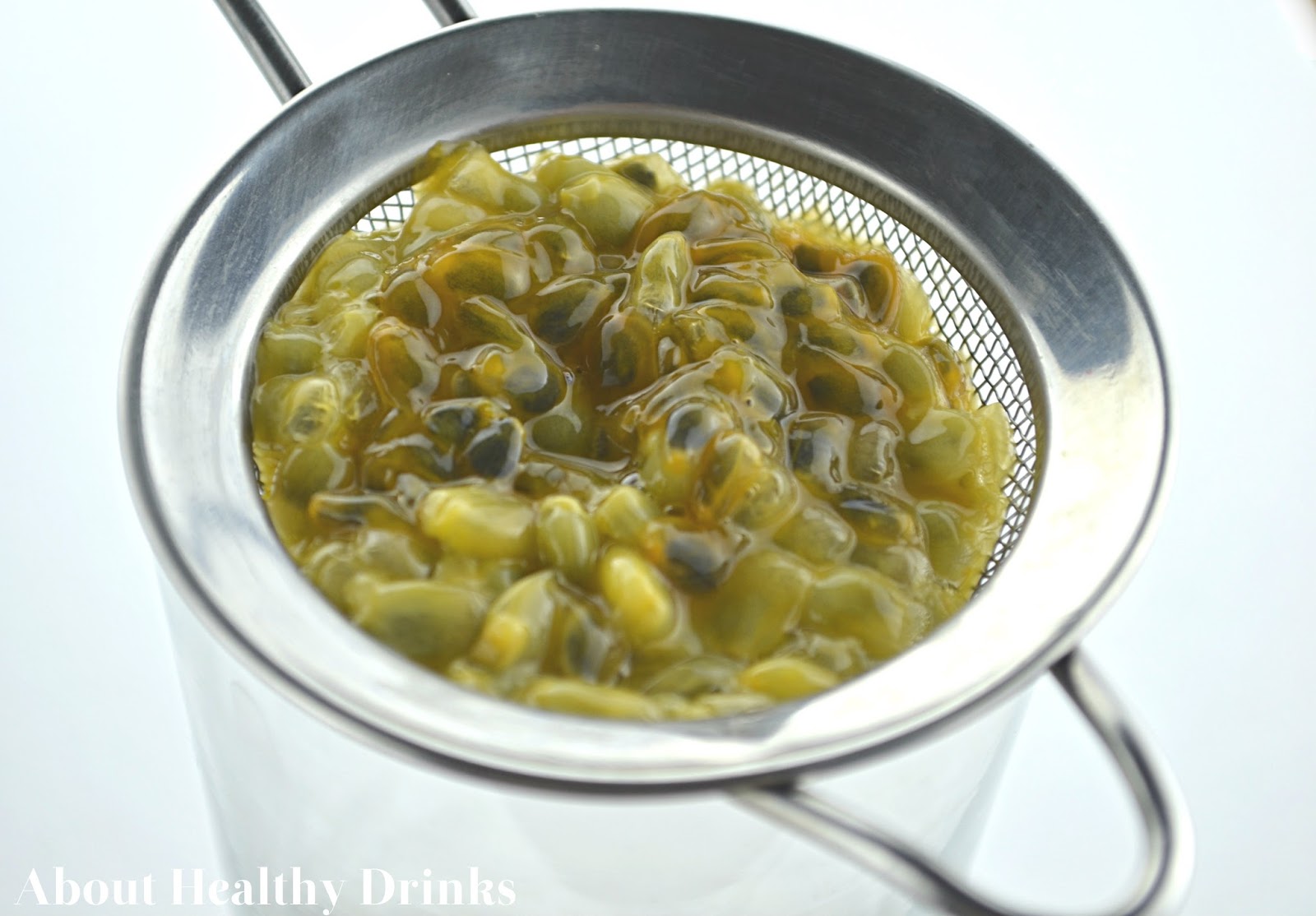 Cut 4 passion fruit each in half and scoop out the flesh into a blender or the jar. You can blend the passion fruits for 1 or 2 minutes or use a sieve to catch the pips.